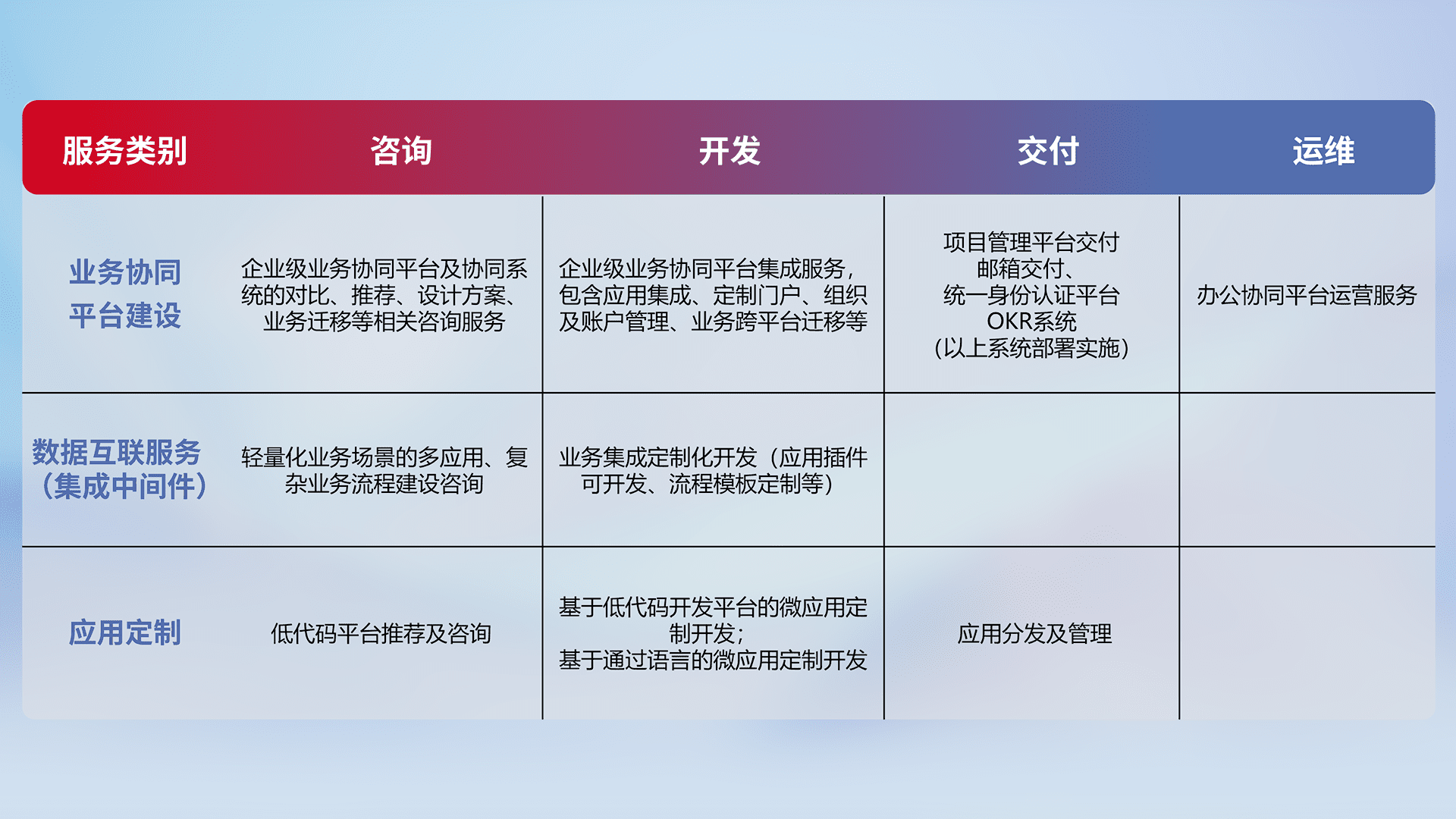 针对钉钉、、、、企微、、、IDaas等平台级产品提供产品的规划、、方案、、、、交付、、、、定制化开发等服务,,,实现如统一协同办公、、、智能客户服务、、混合会议管理、、、智能数据查询、、、、等业务场景,,实现数字化转型。。