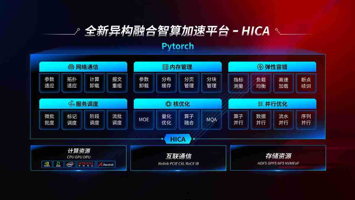 通过自研的服务层、、、中间适配层、、、、以及调度编排算法,,,采用数据并行、、模型并行等多种并行方式,,把并行计算任务进行有效的分解,,,使其分别由相应的软件栈和算力资源来承接。。当GPU资源变化,,,,HICA可以实时动态调度计算子任务并调整模型拓扑和架构,,以充分聚合各种算力资源。。。。